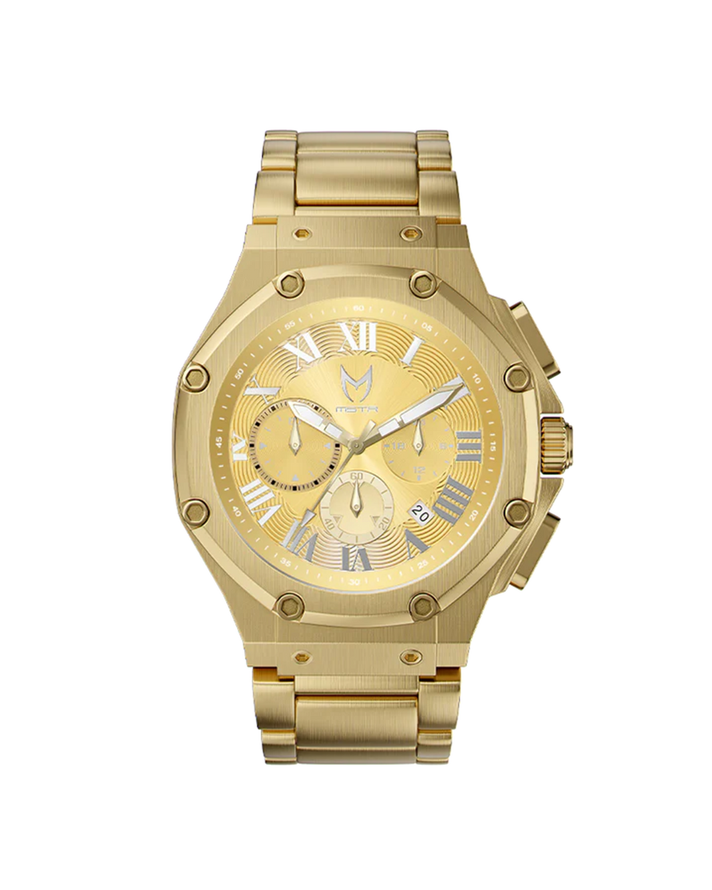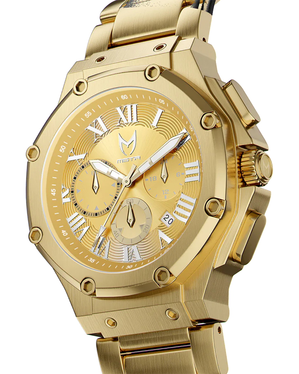 Introducing our 14K Yellow Gold Ambassador, a masterpiece of luxury and refinement that perfectly captures elegance and sophistication. Meticulously crafted from high-grade 316 stainless steel, this exquisite timepiece proudly presents our iconic signature hexagon bolts and a meticulously brushed multi-piece case. The captivating design boasts a radiant gold dial face adorned with resplendent gold Roman numerals and sub-dial hands, and striking blue second hand. Protected by a scratch-resistant sapphire crystal.