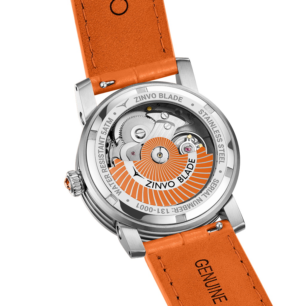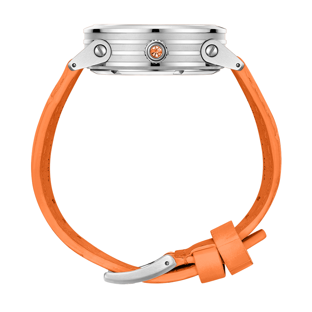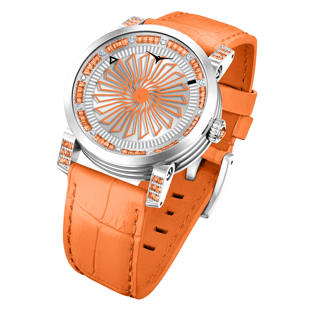 The Blade Citrus Gem bursts with sunlit energy—its radiant silver dial spins with vivid orange artistry, framed by fresh-cut gemstone brilliance. Paired with a bold citrus-orange leather strap and silver accents, this watch is pure vitality on your wrist. Daring, joyful, unmistakably chic—perfect for women who light up every room and color outside the lines.