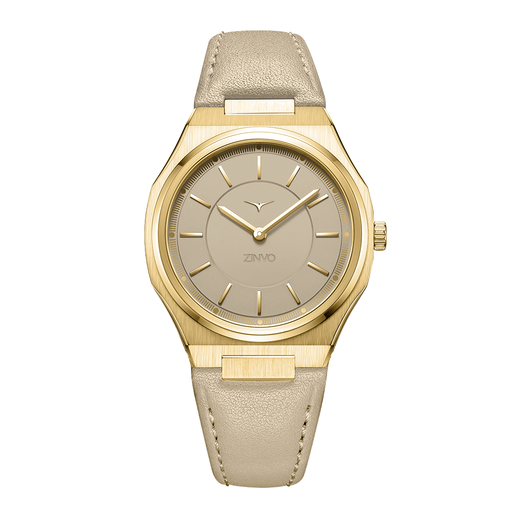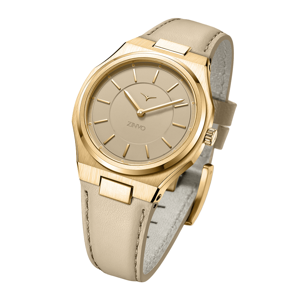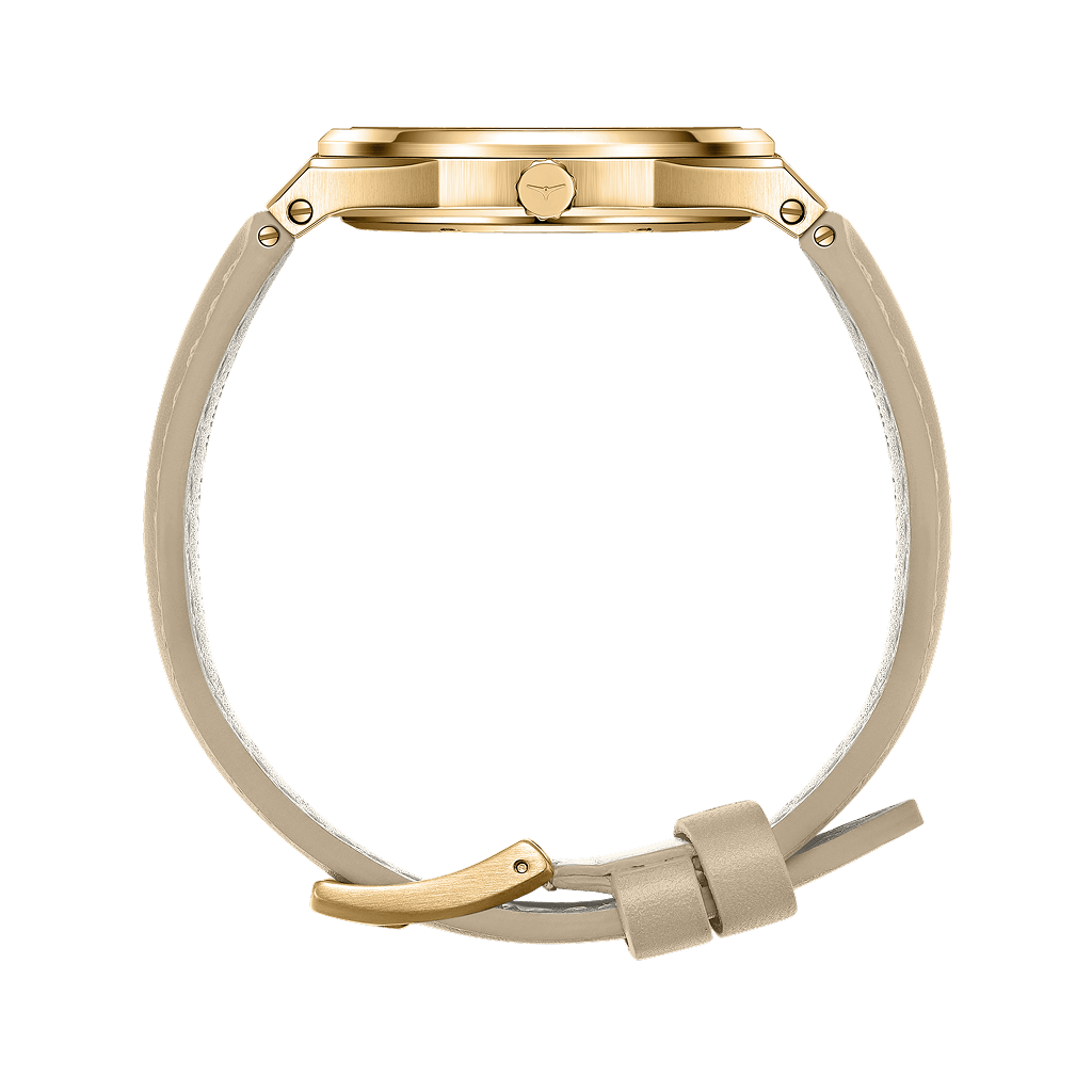 Soft sand hues meet gleaming yellow gold in this women’s watch, offering a versatile design that elevates any outfit with subtle luxury.