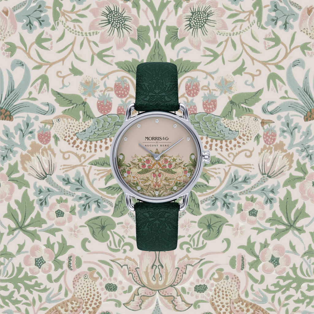 August Berg MORRIS & CO. PETITE Fennel Silver Pink Dial Strawberry Thief | Dark Fennel Embossed Leather 26mm