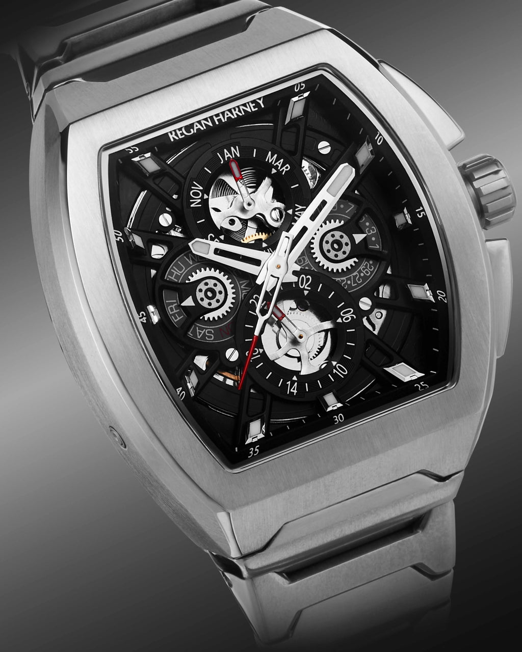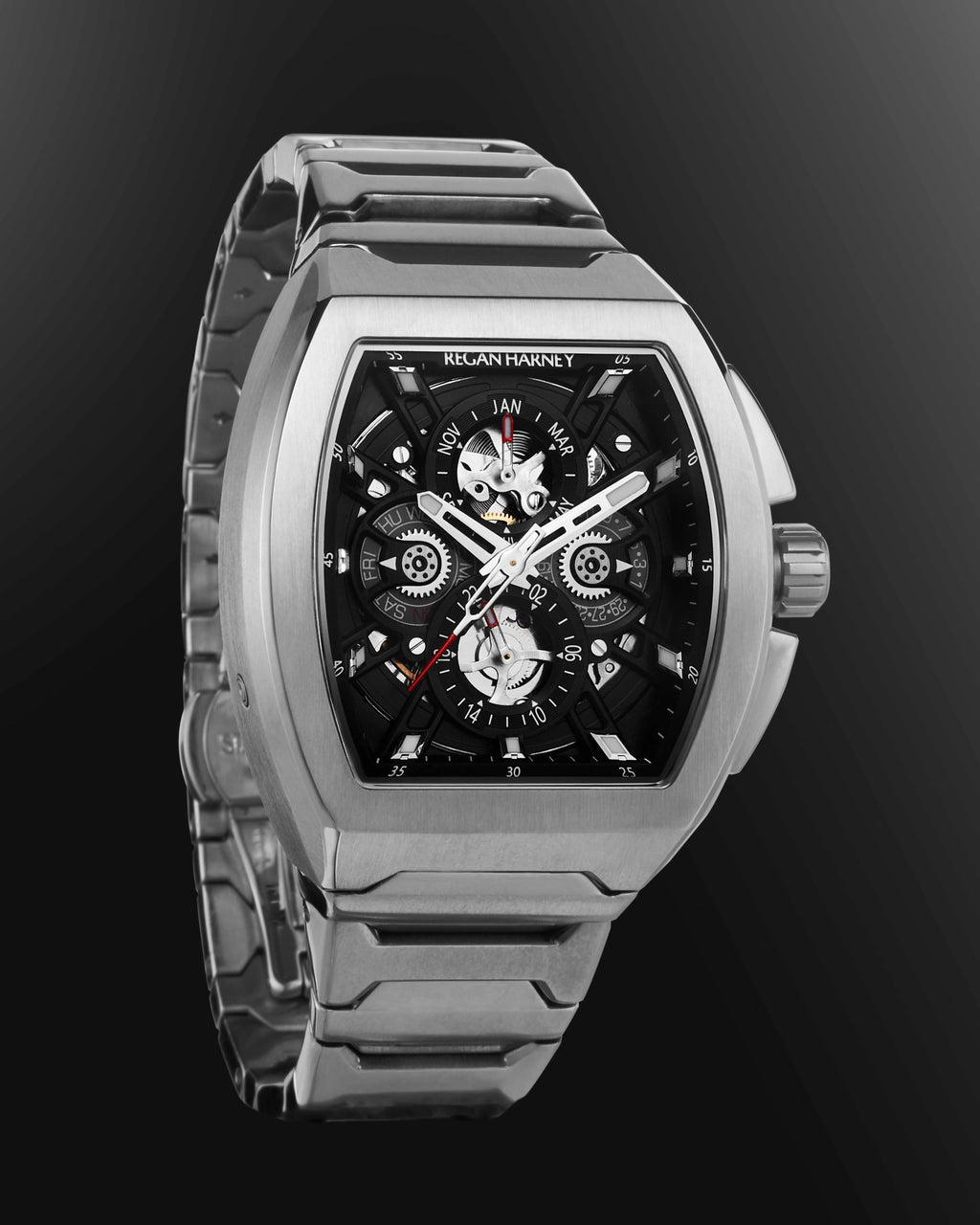 The RH A1-41 " Veron " With VERON, Regan Harney enters a new era of design — bolder, sharper, unapologetically refined. As the brand’s most progressive men’s timepiece to date, VERON is a powerful fusion of architectural form and mechanical soul. Every edge is intentional, every movement — a quiet revolution. This is not an evolution. It’s a statement. A breakthrough in craftsmanship. A redefinition of modern masculinity. And a bold new signature in the legacy of Regan Harney. VERON isn’t inspired by time. It was created to transcend it.