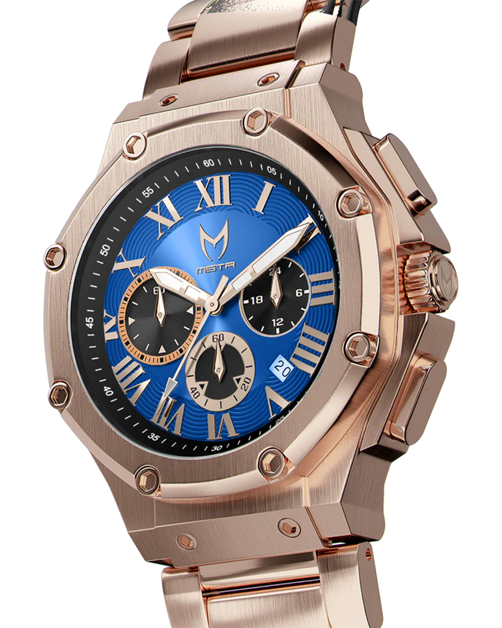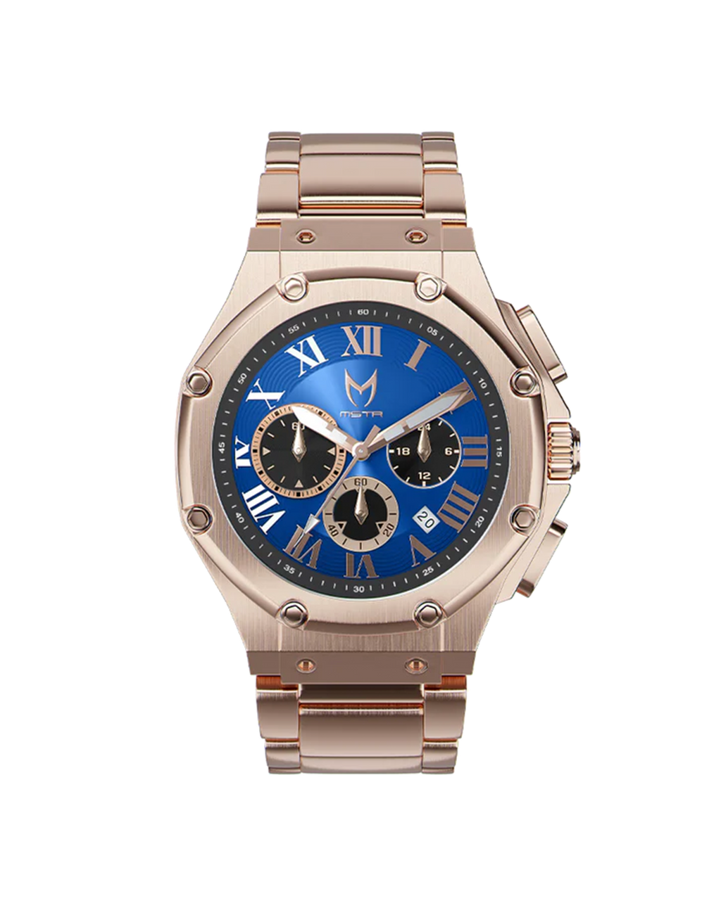 Details matter in well-made watches, which is why MSTR brings to you its Ocean Blue Ambassador—a luxury-designed watch with several functions and a fashion sense. Crafted with 316 silver stainless steel bezel, crown, lug, and hexagon bolts, the Ocean Blue Ambassador exudes understated charm. The blue sun-ray dial and three subdials, along with the rose gold Roman numeral-stick indices, lend the timepiece a captivating modern air. Pair the Ocean Blue Ambassador with the timeless stainless steel three-link band for formal occasions or black rubber strap for casual get-togethers. Either way, you’ll make a statement wherever you go!